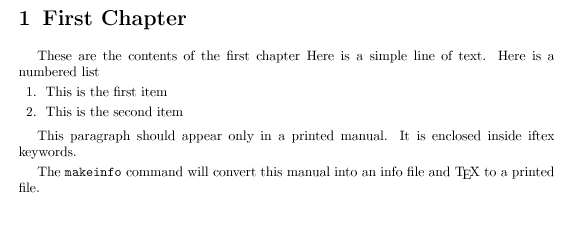 Αυτό όμως δεν πρέπει να σας φοβίζει αν δεν γνωρίζετε το Latex. (Αν και κάποια στιγμή πρέπει να μάθετε και Latex :-). Το Texinfo είναι ένα επίπεδο πιο πάνω από το Latex. Αυτό σημαίνει ότι αποκρύπτει από εσάς τα \verylongandcomplicatedLatexdirectives και σας επιτρέπει να γράψετε το κείμενο σας με μικρά @commands δηλαδή εντολές/keywords που απλά ξεκινάνε με το @. Τα @commands είναι όλα documented στο manual του texinfo το οποίο είναι γραμμένο επίσης σε (μαντέψτε!) texinfo. Έτσι υπάρχει το @chapter, @section ,@code, @itemize με απλά και κατανοητά ονόματα. Αν μάλιστα χρησιμοποιείτε emacs θα βρείτε ότι η συγγραφή texinfo αρχείων με το αντίστοιχο mode είναι πραγματικά πολύ εύκολη.