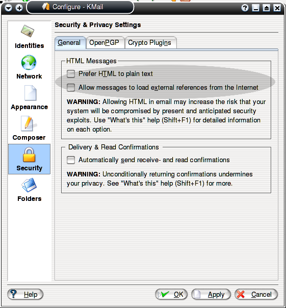 Η μόνη άμυνα για αυτή την παραβίαση του προσωπικού μας χώρου είναι η απαγόρευση των HTML email. Ο Mozilla Mail[33] και το KMail[34] έχουν ρυθμίσεις για να σας βοηθήσουν να αντιμετωπίσετε τα web bugs, που είναι τελικά τελείως άχρηστα σε εμάς, και πολύ χρήσιμα στους spammers.