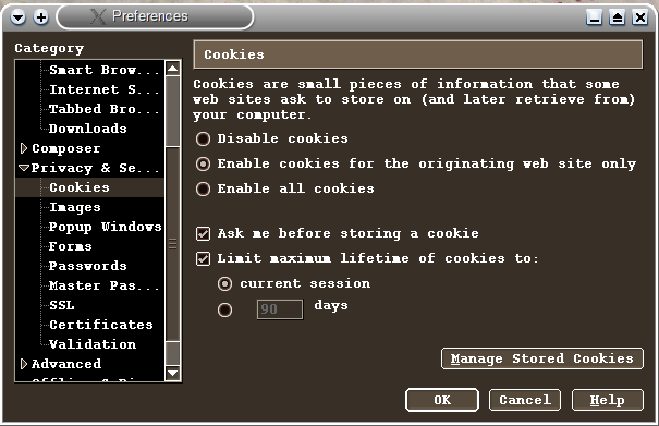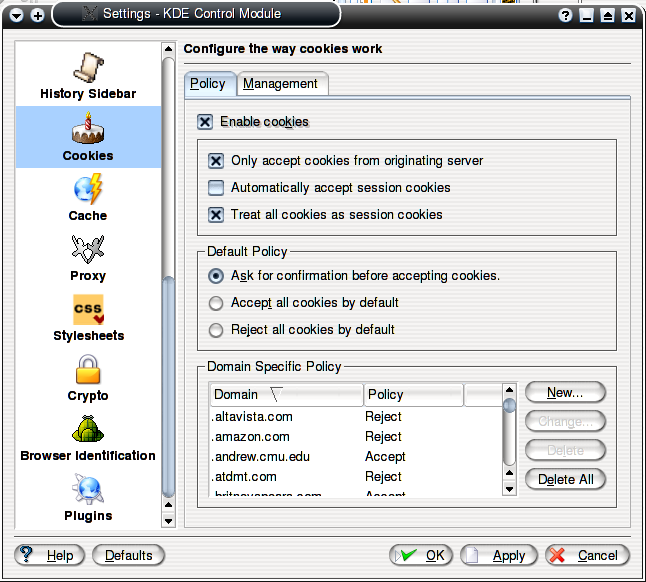 Για να αμυνθούμε έναντι των cookies, πρέπει απλά να ρυθμίσουμε τον browser μας να μας ρωτάει τι να κάνει κάθε φορά που κάποιος προσπαθεί να μας δώσει cookie. Και ο Mozilla[31] και ο Konqueror[32] έχουν πολύ ωραίο τρόπο αντιμετώπισης των cookies. Μπορούν να ρυθμιστούν να θυμούνται την επιλογή του χρήστη (αποδοχή ή απόρριψη cookies από ένα συγκεκριμένο site), και να σβήνουν όλα τα cookies με το που κλείνουμε τον browser. Έτσι κρατάμε τις χρήσιμες λειτουργίες των cookies επιλεκτικά, όπου τις χρειαζόμαστε, και σιγουρεύουμε ότι δεν μπορεί κανείς να μας παρακολουθήσει την επόμενη φορά που θα ανοίξουμε τον browser μας.