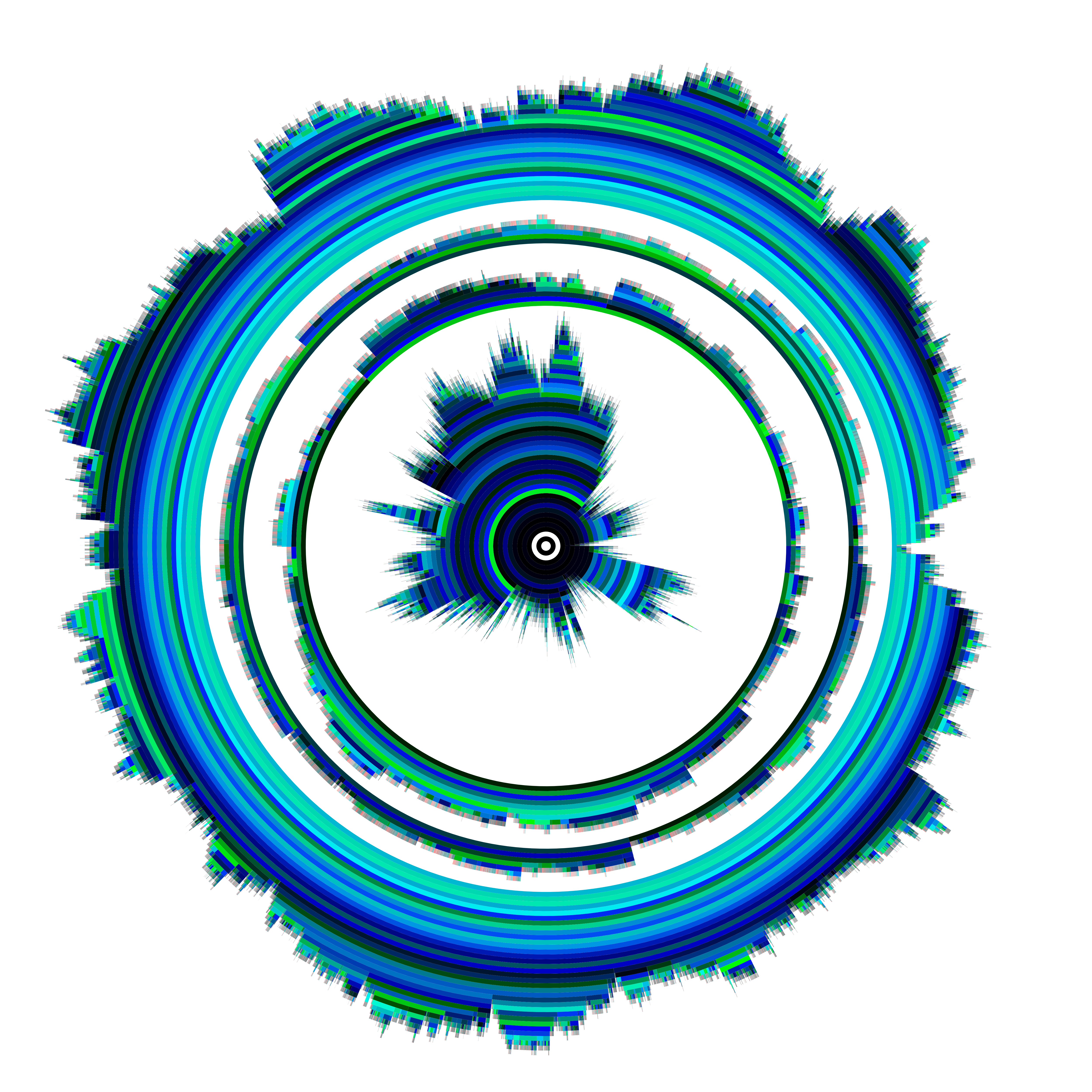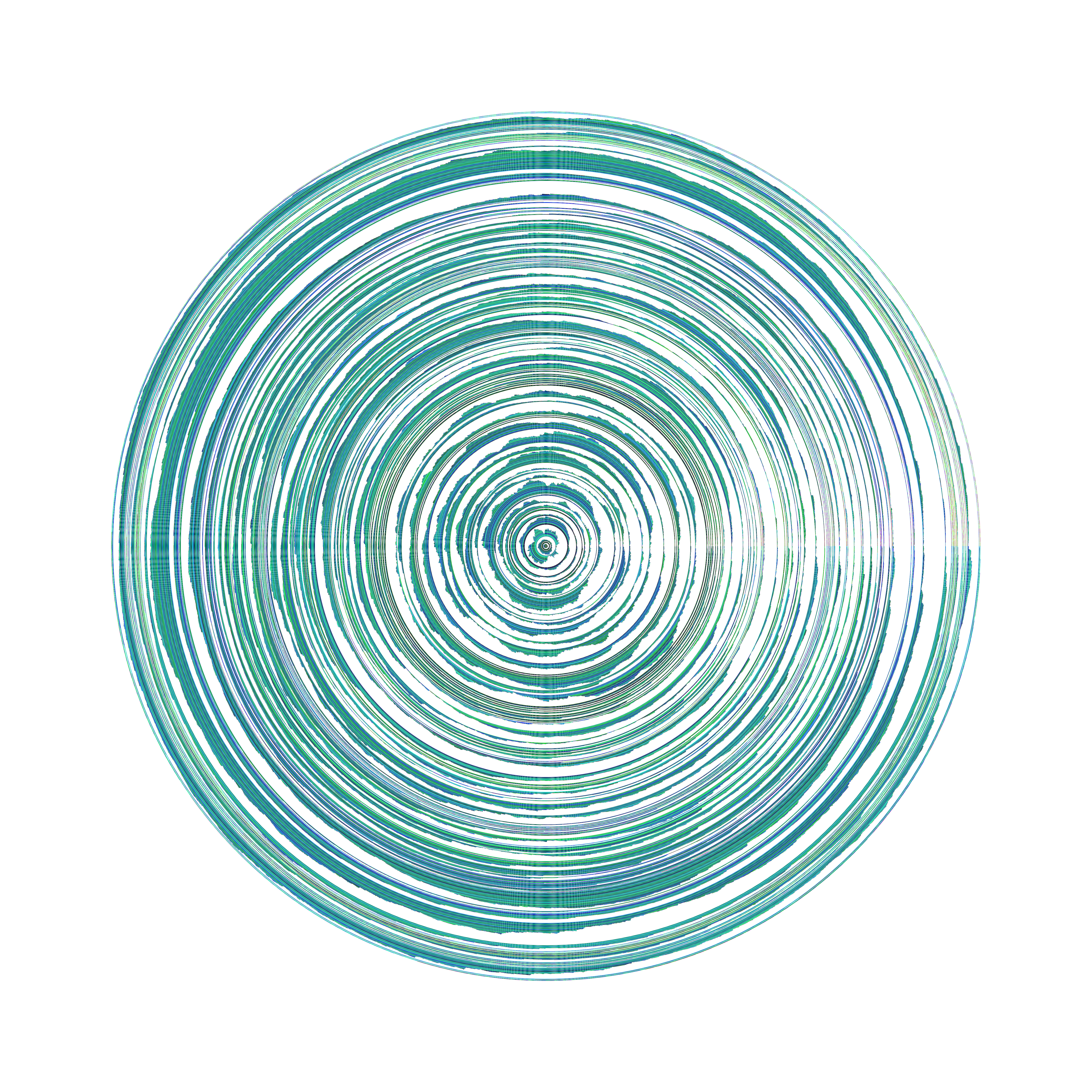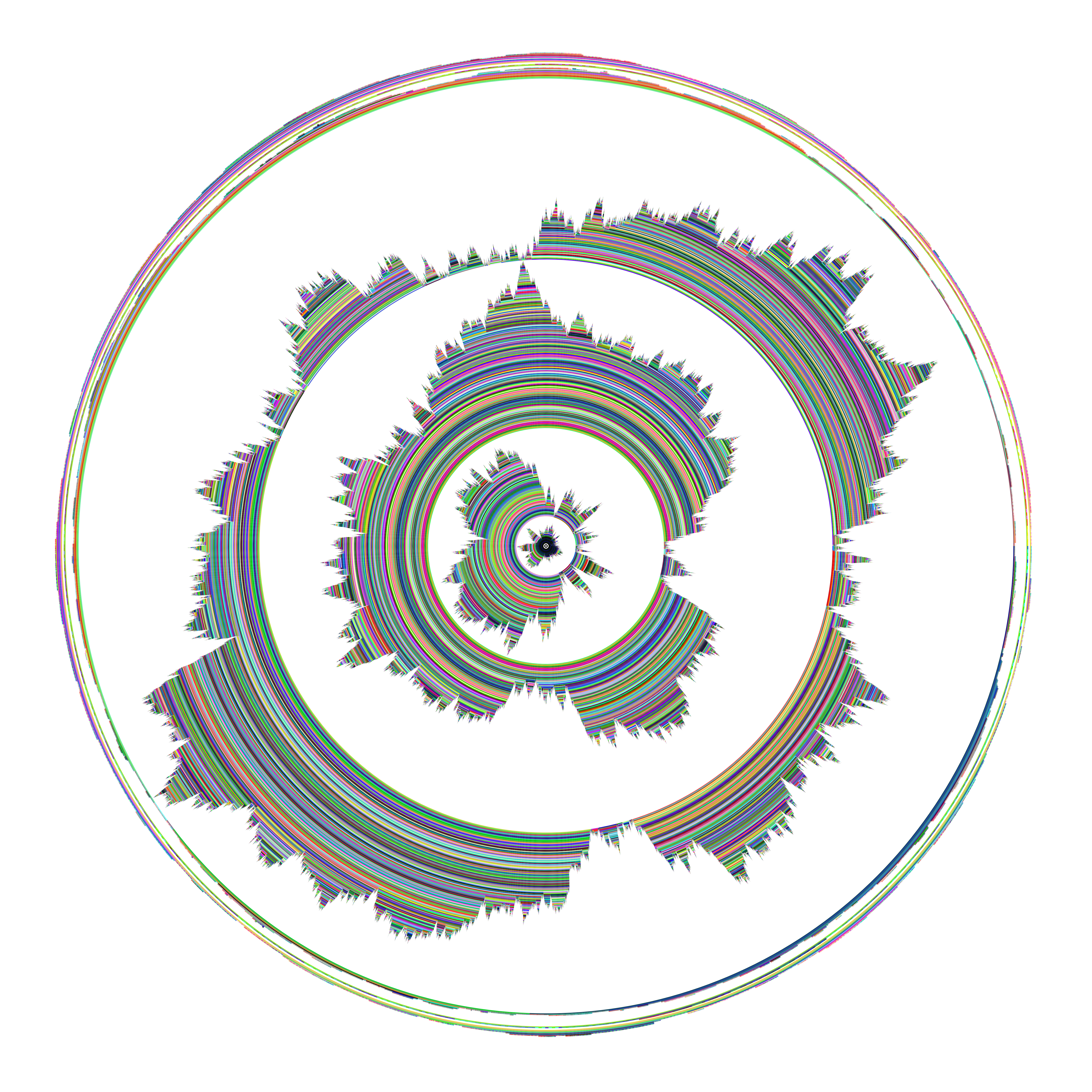 An important feature I had to implement was proportional slice sizes. If I were to give each child of a color an equal size on that arc's edge the image would simply not work. Some branches of the tree are extremely deep, while others are very shallow. If all were given the same space, those deep branches wouldn't even be representable by a single pixel's width, and would simply fail to show up. So I implemented proportional slice sizes, where the size of every slice is determined to be proportional to how many total (recursively) children it has. You can see this in the above example, where the second level arc is largely comprised of one giant slice, with many smaller slices taking up the end.