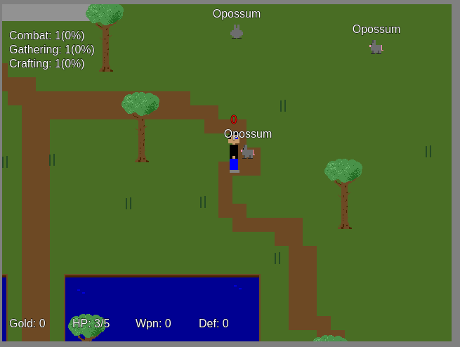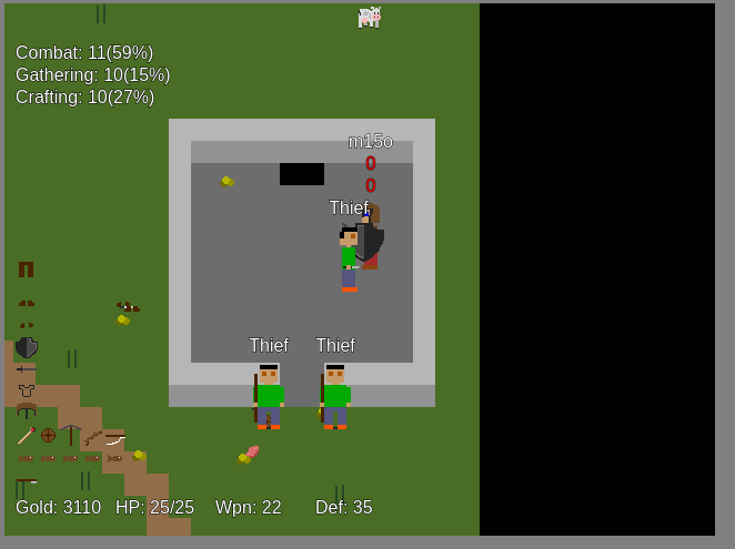 Thiefs are bad people, so we can go there and fight them. I'd suggest getting some xp from killing cows and opossum first, because they can hurt quite a lot. Diving in their lair, there are even stronger Thiefs, the Rogues.