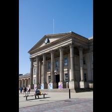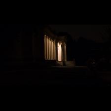 The portico of the Mappin Art Gallery, Weston Park, Sheffield, at night.