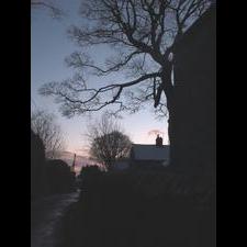 The sun falls on the side of North Lees Hall, Outseats, Derbyshire. Stanage Edge is in the background.