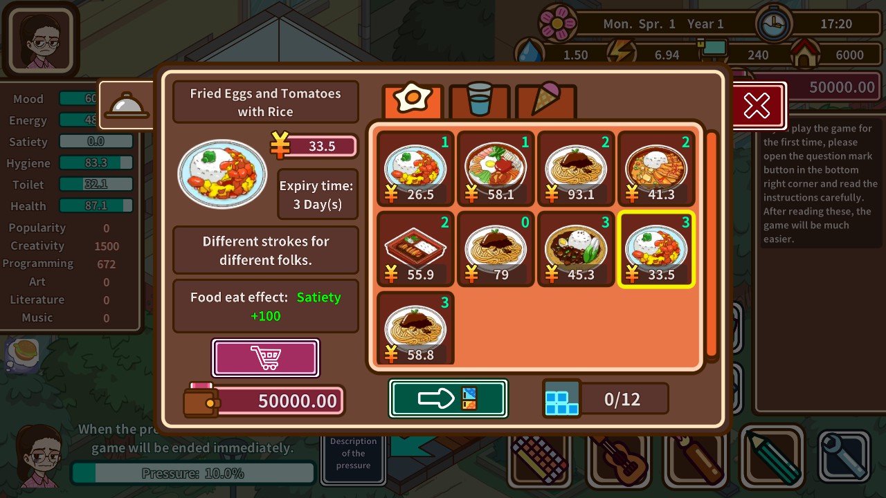 Budgeting actually because a big part of the game as a result of this. Players need to be smart about what they buy for food, considering price and how many days before the food goes bad. If they start selling comics, they need to worrying about the costs for warehouse space, and there are even incidentals. Family members can become ill and your character can choose to help pay for medicine, Bai is constantly having to worry about his health, and budgeting for Shen’s games takes a decent amount of consideration. It got to the point in my sessions that I’d welcome days when there were sales at the grocery store and could stock up on cheap food (oddly, food prices fluctuate daily for some reason).
