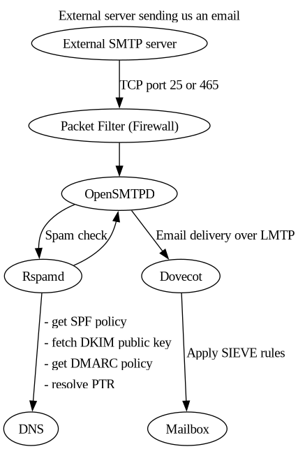 - opensmtpd 25/tcp (smtp): used for email delivery from other servers, supports STARTTLS