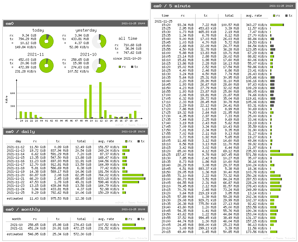 Hi! If you run a server or a router, you may want to have a nice view of the bandwidth usage and statistics. This is easy and quick to achieve using vnstat software. It will gather data regularly from network interfaces and store it in rrd files, it's very efficient and easy to use, and its companion program vnstati can generate pictures, perfect for easy visualization.