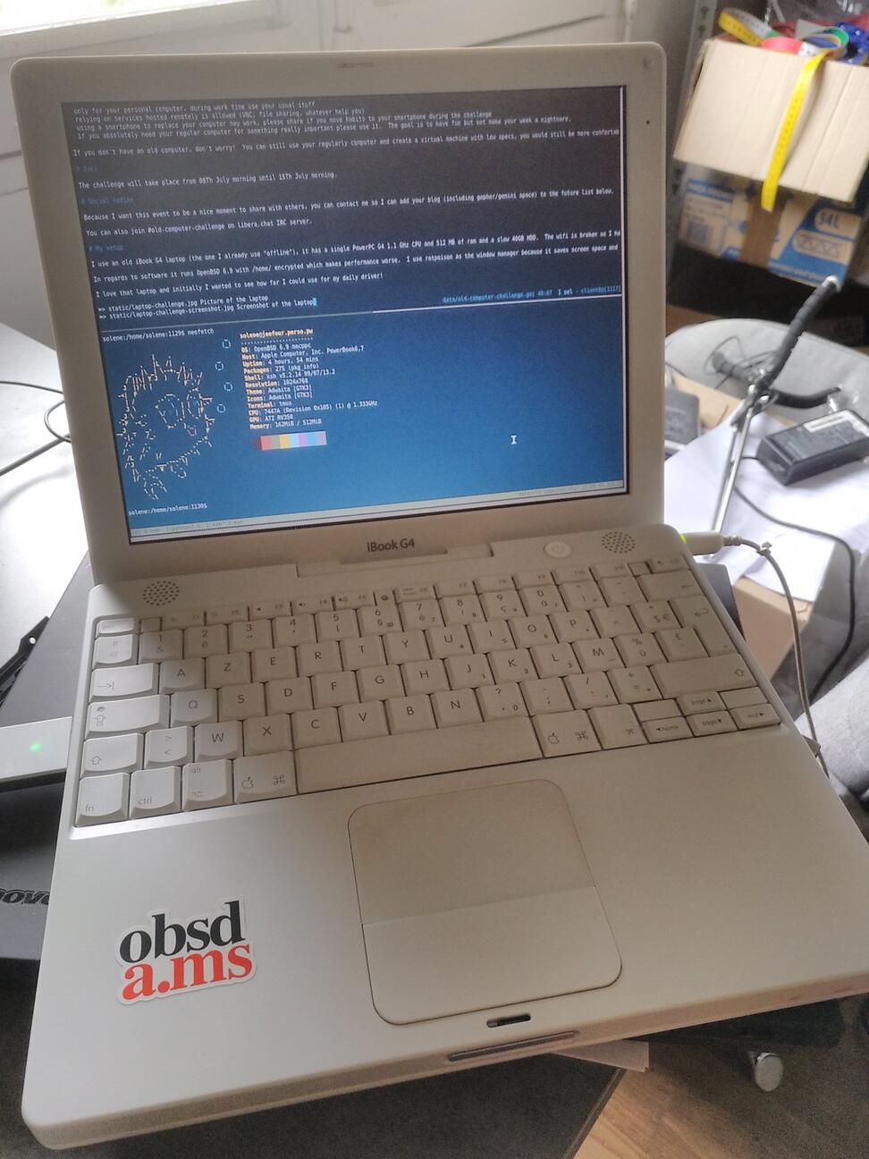 I use an old iBook G4 laptop (the one I already use "offline"), it has a single PowerPC G4 1.3 GHz CPU and 512 MB of ram and a slow 40GB HDD. The wifi is broken so I have to use a Wifi dongle but I will certainly rely on ethernet. The screen has a 1024x768 resolution but the colors are pretty bad.