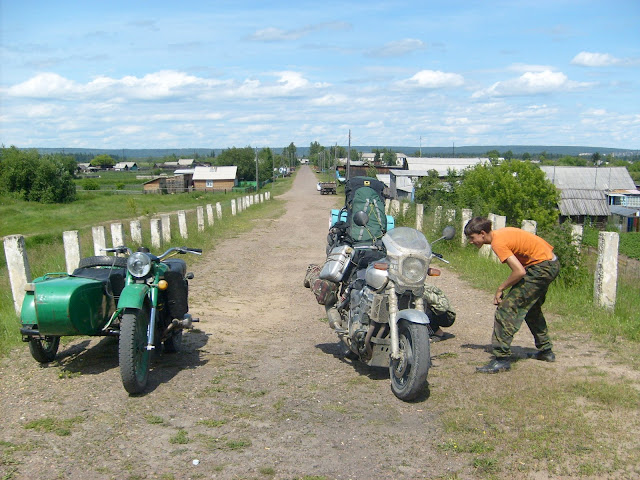 Был интересный момент. Основная дорога на Новосибирск отходила налево, а прямо - в какой-то небольшой городок. Дак вот знак, указывающий это, загородил грузовик и потому все незнающие люди прямиком ехали в этот городок, куда поехал и я. Поняв, что я заехал не туда - остановился у газо-заправки спросить. Познакомился с товарищем и он пригласил меня испить с ним свежего заварного зелёного чая... Хоть и было уже дело к вечеру, мне надо было ехать, искать ночлег... Но зелёный заварной чай... Устроились мы в домике заправки пить чай и наш разговор плавно от мотоциклов перешёл к религии (товарищ является свидетелем Иеговы). Довольно интересно поболтали на спорные вопросы о том, что местами в библии запрещается думать (подвергать сомнению учение), а необходимо просто верить, но как же не думать - ведь опыт жизненный именно анализом жизни получается... :-) В общем, напившись чаю, съев вкусный тортик, который тут же с пылу с жару купили в соседнем цехе кондитерских изделий, я поехал далее.