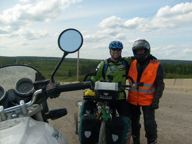Пишут книгу. К каждому велосипеду подцеплен прицеп, у Дениса - 55 килограмм. В общем не лёгкое дело. Помог им забраться в горку и поехал дальше. Молодцы они. Вот их сайт: http://www.denis-katzer.com