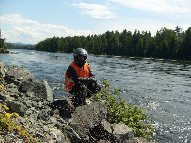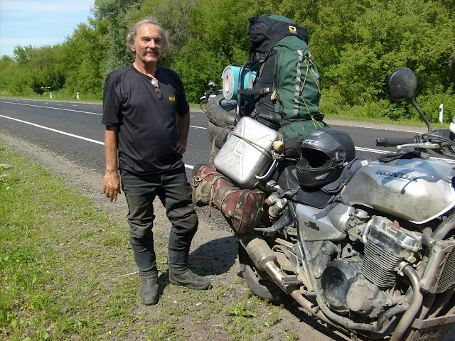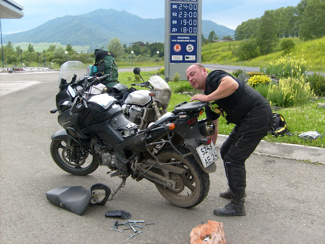 Там же встретил нашего сотоварища-байкера из россии. Он оставил свою жену "отпаривать болячки в грязевых ваннах" в каком-то из Алтайских оздоровительных комплексов, а сам на мотоцикле поехал в горы Алтая, где штурмовал броды, карабкался по горным дорогам, где не раз падал и кончил цепь, после чего кое-как на ней пополз обратно и встретил меня, где и обрёл смазку для цепи :-)