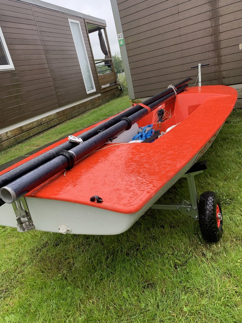 Unsere Jolle ist 3,38m lang, wiegt 43kg und hat zwei mögliche Segel, eines mit 4,2qm und ein größeres mit 5,3qm. 43kg ist schon etwas grenzwertig zu handhaben. Ein Laser im Vergleich wiegt allerdings satte 65kg.