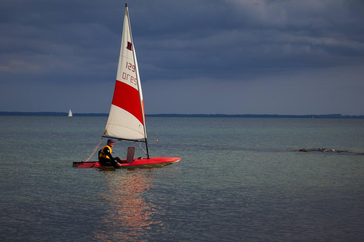 Ein paar Tage später. redshift liegt noch am Strand in Løjtland in Dänemark. Wir konnten ein paar schöne Stunden auf ihr durch die Genner Bucht und vor dem Strand von Sandskær segeln, mal mit Wind aus West, mal aus Ost. Die Bucht ist ein herrliches Jollenrevier.