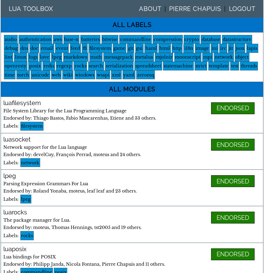 That website, Lua Toolbox, was inspired by the popular Ruby Toolbox [3]. It had two major features: modules classification ("labels") and endorsements by users. I had written it using Leaf Corcoran's relatively new Lua Web framework, Lapis [4], and Redis as the datastore.