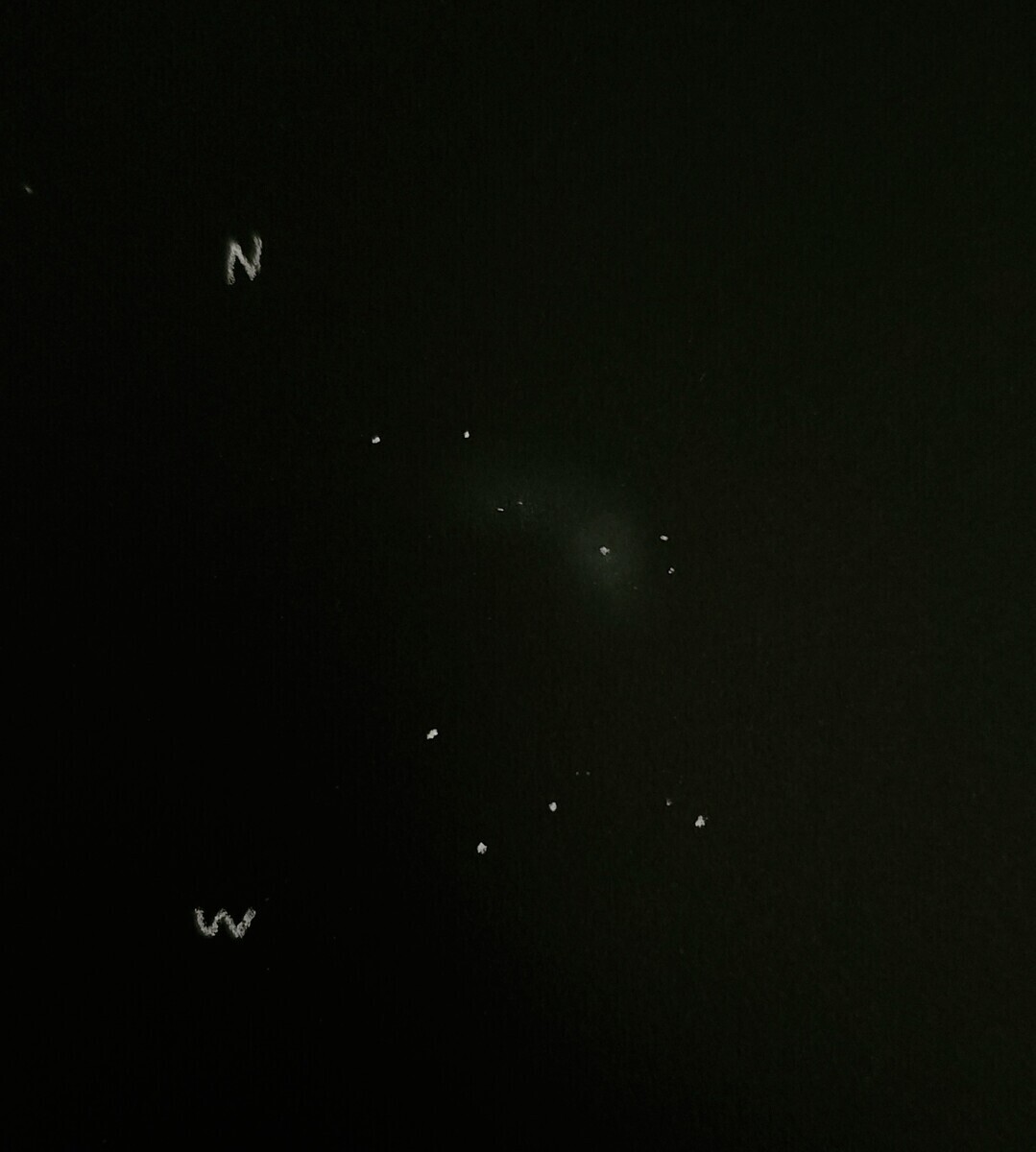 Two galaxies here. The one to the south is a little more visible. Detection of both almost requires AV. A tiny speck of a core can be seen in both.