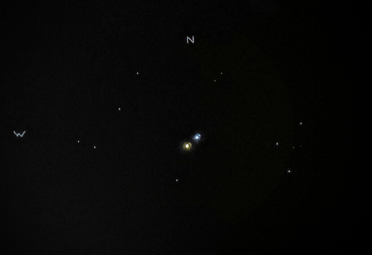 What better target is there to test colors on than β Cygni? The experience of sketching this in the field tonight showed me how difficult this new method can be under a red-lamp. The red-lamp washed all color out of the sketch, so I was applying color based on gut feeling rather than sight.