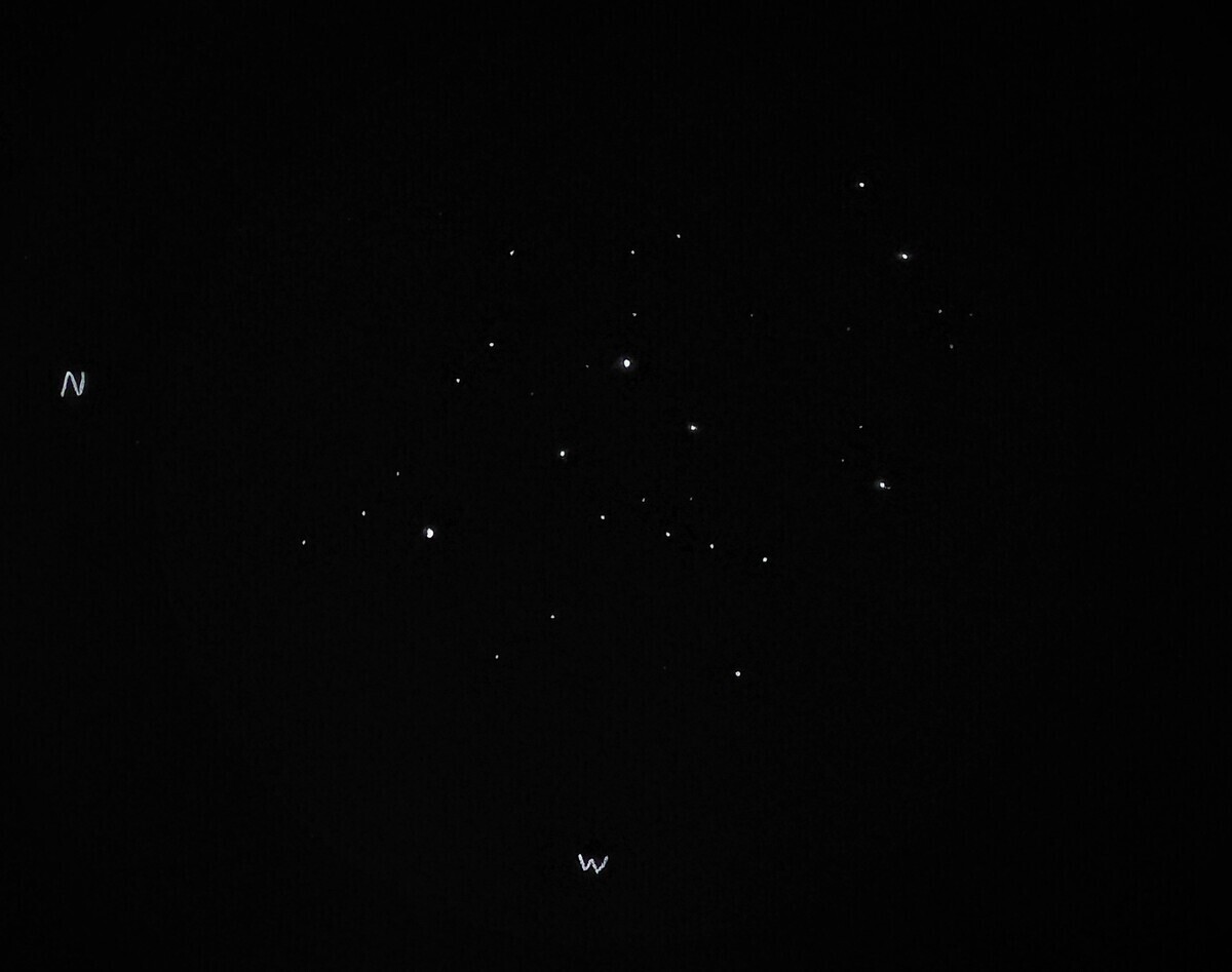 Lovely cluster! δ² Lyrae is the brightest star just east of center in the sketch. It had a nice warm orange color to it (I didn’t bring an orange pencil out with me!). δ¹ Lyrae is the brighter star to the north west, it had a subtle white-blue color.