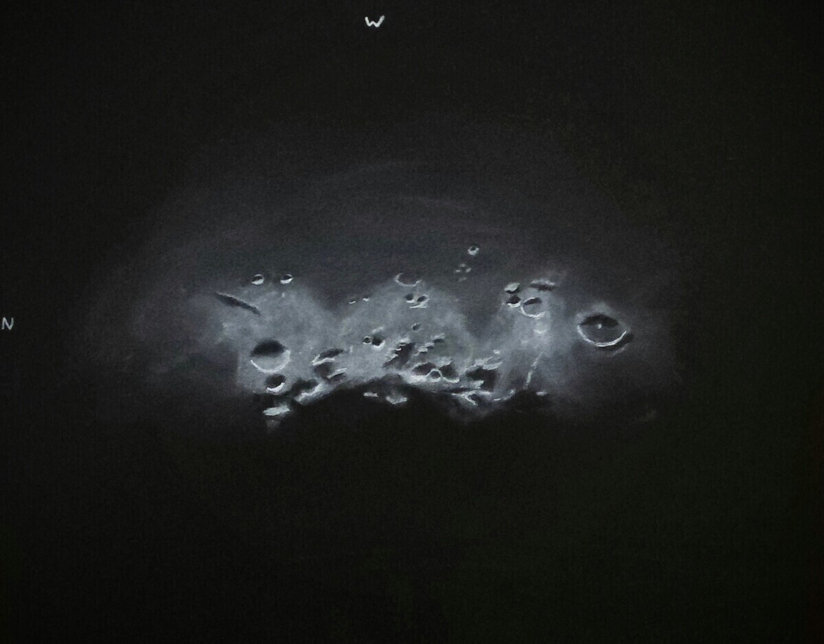 Palus Somni is the lighter region. Mare Tranquilitatis is the flatland to the west and Mare Crisium is behind the ridge-line and terminator to the east. Proclus is the smaller crater almost dead center in the sketch (it has a tiny crater just north of it.