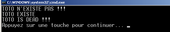 ::TEST EXISTENCE VARIABLE TOTO IF NOT DEFINED TOTO ECHO TOTO N'EXISTE PAS !!! ::CREATION DE LA VARIABLE TOTO SET TOTO=J'EXISTE IF DEFINED TOTO ECHO TOTO EXISTE ::DESTRUCTION DE LA VARIABLE TOTO SET TOTO= IF NOT DEFINED TOTO ECHO TOTO IS DEAD !!! PAUSE TOTO N'EXISTE PAS !!! TOTO EXISTE TOTO IS DEAD !!! Appuyez sur une touche pour continuer...