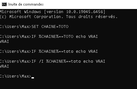 SET CHAINE=TOTO IF %CHAINE%==toto ECHO VRAI