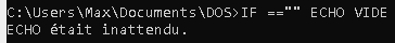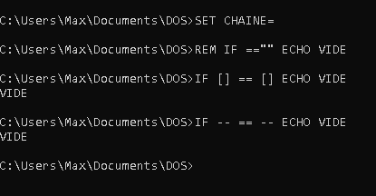 ECHO ON SET CHAINE= REM IF %CHAINE%=="" ECHO VIDE IF [%CHAINE%]==[] ECHO VIDE IF -%CHAINE%-==-- ECHO VIDE