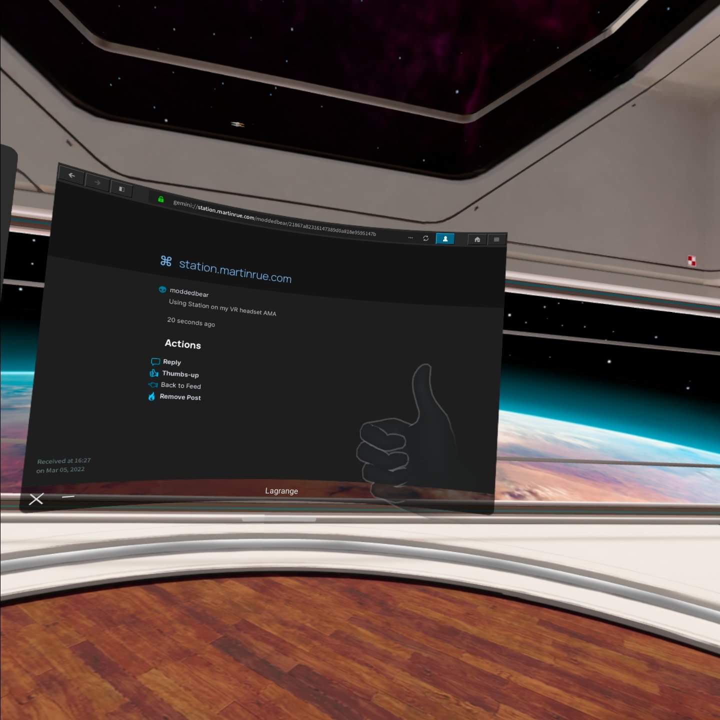 @cobradile94 The Quest 2. It's Android based so I was able to install the Android version of Lagrange. It's surprisingly usable after tweaking Lagrange's UI scale a bit! Getting my Station certificate imported was an adventure though. · 3 years ago