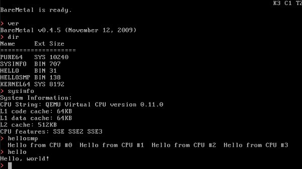 Baremetal dispone de una interfaz de líneas de comando que permite al usuario cargar datos o programas desde un disco duro. La creación de este sistema se basó en MikeOS, un sistema de 16 bits escrito en Ensamblador, que se utilizaba como una herramienta de aprendizaje para ver el funcionamiento de un sistema operativo sencillo.