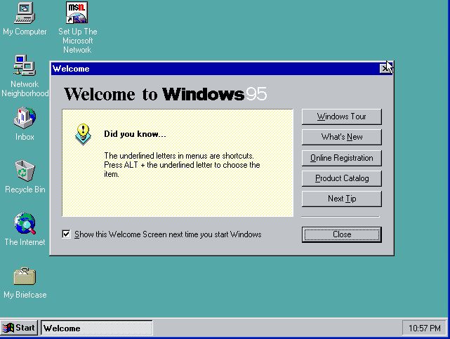 Windows 95 (nombre clave: Chicago) es un sistema operativo gráfico híbrido entre 16 y 32 bits para PC's IBM y clónicos. Fue publicado el 24 de agosto de 1995 por Microsoft con notable éxito de ventas. Sustituyó a MS-DOS [1] como sistema operativo y a Windows 3.x como entorno gráfico.