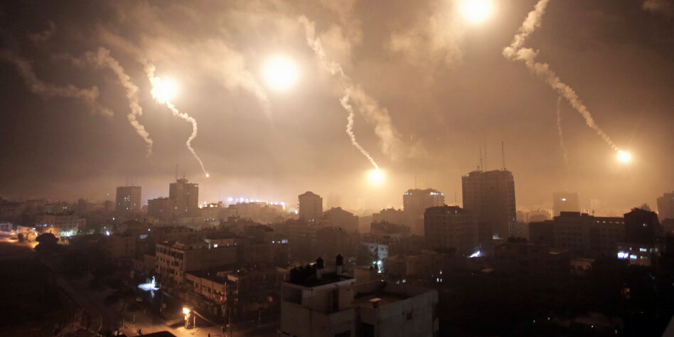 In der Nacht auf Dienstag donnern Kampfjets über Gaza, Drohnen sirren und Leuchtstoffkugeln weisen den Raketen den Weg. Unser Autor ist mittendrin.