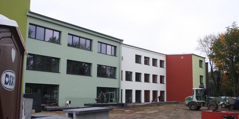 Noch fahren die Bagger vor der grün-rot-weißen Fassade, die nach allen Regeln der Kunst wärmegedämmt wurde. Das Künstlerhaus wurde realisiert als Projekt der Internationalen Bauausstellung (IBA). Am Samstag werden die 44 Ateliers eröffnet. Die Räume sind zu 85 Prozent vermietet. Für die verbleibenden 15 Prozent sind Bewerbungen zu richten an den Verein Veringhöfe, der das Künstlerhaus in Selbstverwaltung organisiert.