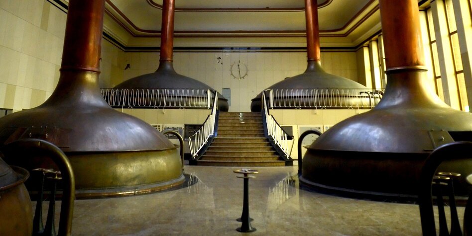 Der Wind pfeift über die weite Fläche, wo einmal im Minutentakt Pferdekutschen an- und abfuhren. Sie brachten leere Bierfässer und nahmen die vollen wieder mit, verteilten sie von Neukölln aus in die ganze Stadt. Das laute Treiben, das auf dem Vorplatz der Kindl-Brauerei stattgefunden hat, die schnaubenden Rösser – man kann es sich heute nicht mehr vorstellen beim Blick über den zugigen, menschenleeren Platz. Ganz in der Nähe wurde im 19. Jahrhundert das erste Kindl-Bier gebraut, vor den Toren der wachsenden Metropole. 1930 folgte der neue Klinkerbau im Rollbergkiez, errichtet mit dem Anspruch, das schönste Brauhaus Europas zu sein: Schmale, hohe Fenster strukturieren die rotbraune Fassade, ein mächtiger quadratischer Turm ragt in die Höhe. Zwei Spitzbögen markieren einen Eingang wie in eine Kirche. Im gut erhaltenen Sudhaus lässt sich der Glanz vergangener Tage erahnen: Sechs blankpolierte Kupferkessel, dazwischen eine elegante Treppe, die auf eine Empore führt – es sind die Details, die dem Bau einst den Titel „Palast Berliner Braukultur“ einbrachten. Bis 2005 war es in Betrieb, dann verlegte Kindl die Produktion nach Weißensee.