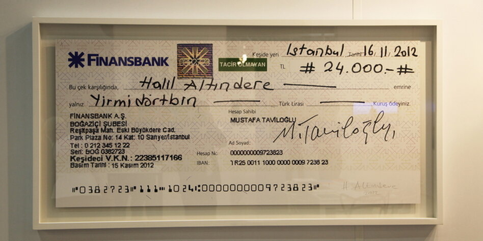 Statt dem türkischen Sammler Mustafa Taviloglu ein Kunstwerk für 43.000 türkische Lira zu liefern, vergrößerte der Guru der türkischen Politkunst den Scheck des Mäzens und machte ihn – sauber eingerahmt – zum unverkäuflichen Kunstwerk.