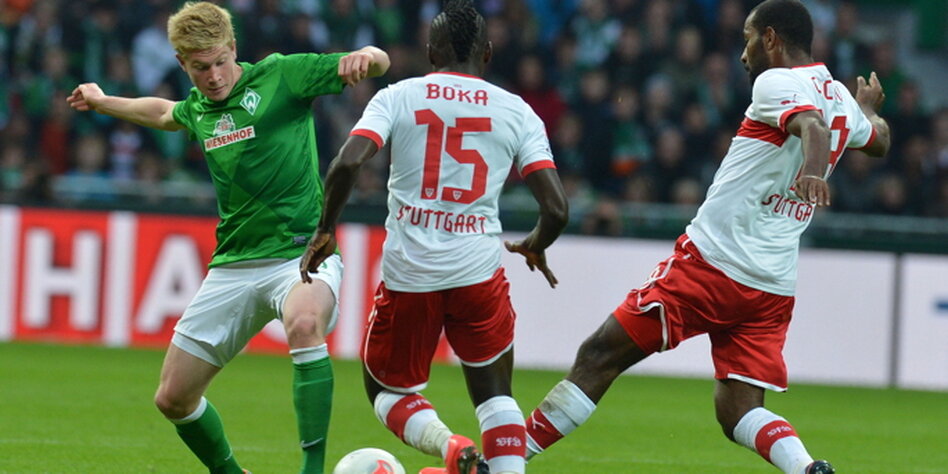 Dabei hatte es lange gut für die Gastgeber ausgesehen: Mit einem Weltklasse-Tor hatte de Bruyne die Bremer in Front gebracht - es war der 100. Heimspiel-Treffer der Bremer gegen den VfB in der Bundesliga-Geschichte. Die Chelsea-Leihgabe leitete seinen zweiten Saisontreffer mit einem Doppelpass mit Nils Petersen ein und ließ VfB-Keeper Sven Ulreich keine Chance. Auch am zweiten Treffer war Petersen mit seinem Pass auf Junuzovic beteiligt.
