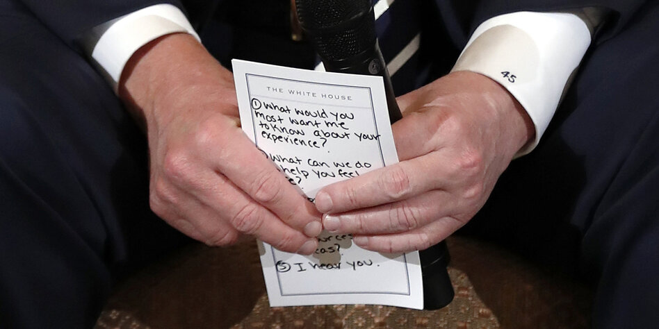 Trump empfing die rund 40 Schüler und Eltern im Esszimmer für Staatsbesuche des Weißen Hauses. „Es gibt nichts schlimmeres als das, was ihr durchgemacht habt“, sagte Trump. Er setze sich für strengere Sicherheitsüberprüfungen und eine Erhöhung des Mindestalters bei Waffenkäufen ein. Während des Treffens hielt der US-Präsident eine Notiz mit Gesprächspunkten in der Hand. Als letzter Punkt stand darauf: „Ich höre euch zu“.