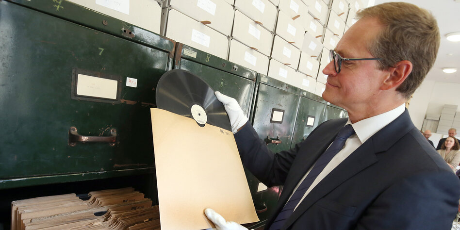 Müller wirkt ehrlich berührt, als Sammlungsleiter Sebastian Klotz eine Schellackplatte mit Aufnahmen eines georgischen Gefangenen auflegt.
