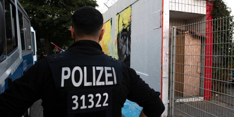 Unter Polizeischutz wird ein Wandgemälde, das den Intensivtäter Nidal R. zeigte, übermalt. R. war am Rande des Tempelhofer Feldes erschossen worden.