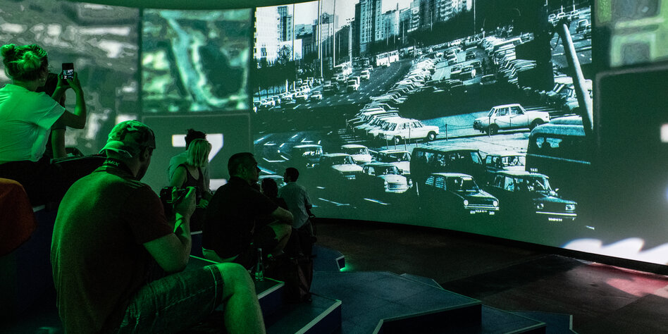 Das Strobo blitzt, der Techno ballert, über die 270-Grad-Leinwand schiebt sich ein animiertes Video. Doch bin ich nicht in einem neuen Berliner Club, sondern in einer Ausstellung zum Thema Stadtgeschichte. Beworben wird sie mit den Worten: „Erlebe in der multimedialen Ausstellung das Berlin der neunziger Jahre“. Aber was ich erlebe, ist der Digitalisierungshype 2019.
