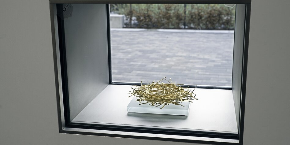 Dieses Kunstwerk aber ist in jeder Hinsicht bemerkenswert. Der Berliner Künstler Thorsten Goldberg hat es ersonnen und sich dabei Folgendes gedacht: Das Nest mit dem offiziellen Titel „24kt“ – für 24 Karat Gold – sollte 14 Jahre lang gut gesichert in der Schule verbleiben und dann, so steht es in einem extra abgeschlossenen Vertrag, in die Verantwortung der Schüler:innen übergehen. Die hätten es einschmelzen, weiter ausstellen, verkaufen, verlosen oder weiß der Geier damit machen können. Wenn das kein künstlerischer Mehrwert ist!