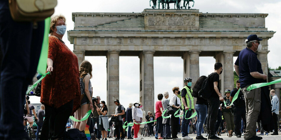 Die Unteilbar-Demos erproben dank Corona Neues: Die TeilnehmerInnen halten Abstandsbänder und rühren sich nicht vom Fleck.