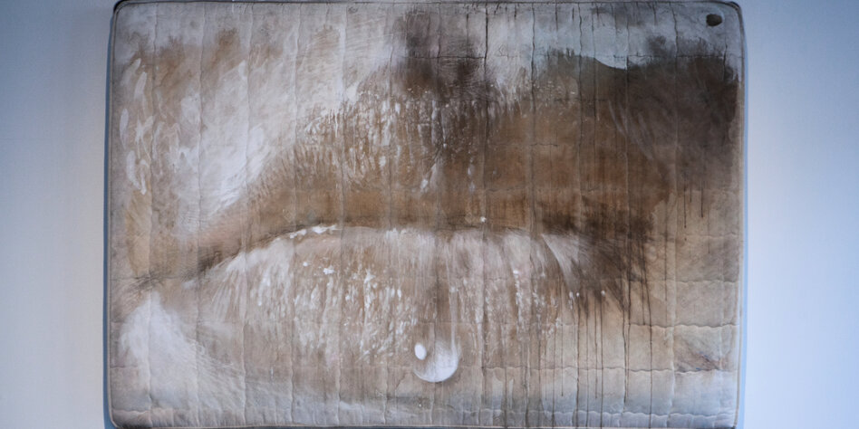 So leicht, so soft, so wortwörtlich lichtdurchlässig war wohl noch keine Ausstellung in der Galerie Wedding wie jetzt [4][„INTIM/E“] von Dirk Bell und Isabel Lewis. Transparente Duschvorhänge teilen den Raum, ein üppiger Blumenstrauß steht inmitten eines sonst minimalen Settings aus Grau, Schwarz und Weiß, Elektrosound hüllt alles in eine sanfte Atmosphäre, und nur leicht zeichnet sich auf einer Queensize-Matratze über dem Eingang das Bild voller, von einem dicken Tropfen benässter Lippen ab. Vor und mit diesem poppig eingängigen und gleichzeitig so unschlüssigen Geschehen zieht unaufhörlich die Weddinger Müllerstraße. Die Schau findet im Rahmen des Programms [5][„Existing Otherwise/ Anders Existieren“] (kurz „XO“) statt, dass [6][2021] in Berlin begann und sich dieses Jahr u. a. am SCCA Tamale [7][in Ghana fortsetzt].