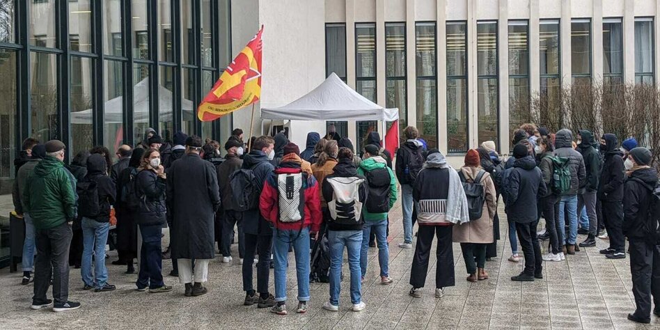 Berlin taz | An der Freien Universität haben am Mittwoch VertreterInnen des AStAs und UnterstützerInnen mit einer Kundgebung das aktuelle Pandemiemanagement und den Umgang mit rechten Ideologien von DozentInnen an der FU beklagt. Sie fordern ein besseres Coronakonzept und eine stärkere Abgrenzung der Uni gegen rechts. [1][Zuletzt sorgte in dem Zusammenhang der Fall eines Biologiedozenten für Aufmerksamkeit.] Die Frage „Wem gehört die Uni?“ prangte auf einem großen Banner bei der Kundgebung – die Studis fordern, dass ihre Belange bei Entscheidungen mitbedacht werden.