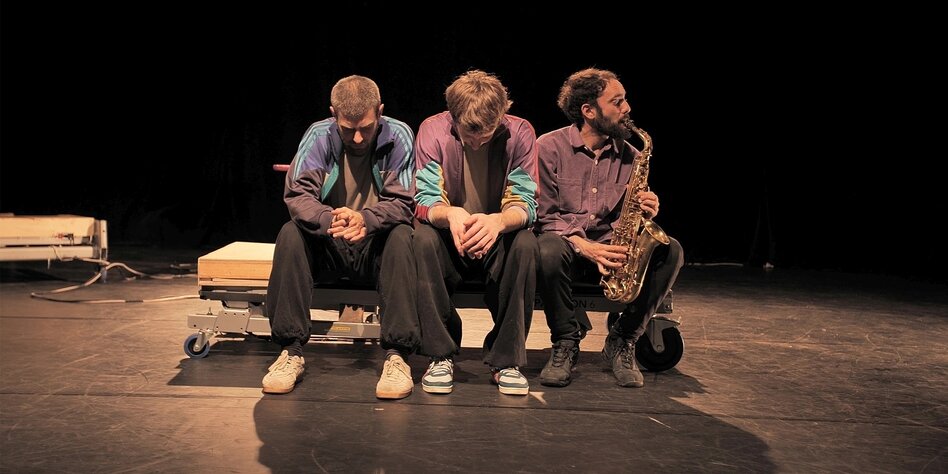 Zeitgenössischer Zirkus kann aber auch rasant sein und komische Qualitäten aufweisen. In „Runners“ befinden sich die beiden Performer Jonas Schiffauer und Pieter Visser auf zwei Laufbändern. Der Musiker Moises Mas García treibt sie mit seinen Rhythmen und auch der Steuerung der Laufbänder mit seiner Hand an. Im Laufen, das mal ein gemütliches Joggen, mal ein schweißtreibendes Rasen sein kann, jonglieren Schiffauer und Visser zugleich mit Bällen. Sie werfen sie sich auch zu oder schießen sich ab wie in einem Duell.