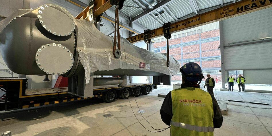 Stolz präsentieren die Männer das, worauf sie seit Monaten hinarbeiten: die neue Flusswärmepumpe, die vorerst größte Deutschlands. Sie soll in Mannheim direkt am Rhein zusammengesetzt werden und ab Herbst Fernwärme produzieren.„Die Einzelteile sind gestern aus Schweden gekommen“, erzählt Rolf Scheinost. Er ist Ingenieur der Firma GKM, auf deren Firmengelände die Flusswärmepumpe steht.