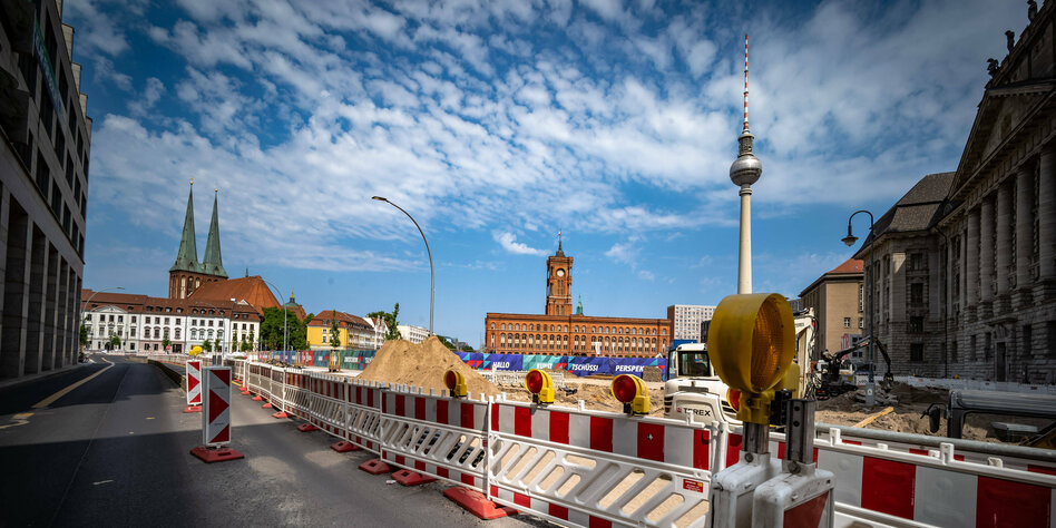 Wer eine Runde um das abgezäunte Areal dreht, könnte kurzzeitig an der Reihenfolge von Gaeblers Plan zweifeln, denn auf dem Platz sind bereits intensive Bodenarbeiten im Gange. Wie kann das gehen: erst mit den Arbeiten beginnen, dann einen Plan beschließen? Doch auch wenn sie imposant wirken, handelt es sich dabei lediglich um die 2019 begonnenen archäologischen Grabungen, wie Gaebler ausführte – immerhin ist der Molkenmarkt ein [2][Ort der Berliner Stadtgründung]. Bis ins Jahr 2024 würden sie noch dauern. Die parallelen Arbeiten sollen an der Grunerstraße bis Ende des Jahres abgeschlossen sein.