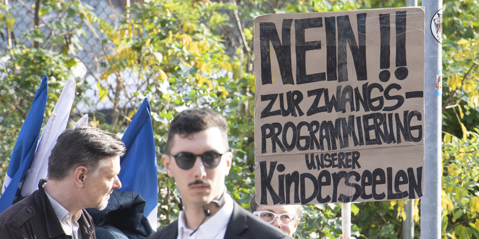 Grund dafür ist ein Aufruf, der im Netz und auf der Straße verbreitet wird: „Pädo-Kita stören“ – so ist ein Flyer überschrieben, der am Rande einer [1][rechtsextremen und verschwörungsideologischen Demo am Tag der deutschen Einheit] im Lustgarten verteilt wurde – auch an die taz. Darin heißt es: „Pädophile versuchen, die gesellschaftliche Akzeptanz für Schwule, Lesben und Transgender auszunutzen, um sich Zugang zu Kindern zu verschaffen!“ Aufgerufen wird, sich per E-Mail für die Veranstaltung anzumelden. Auf Telegram verbreitet der rechtsreligiöse Youtuber Matthäus Westphal („Aktivst Mann“) auf seinem Kanal mit 29.000 Abonnent:innen selbiges.