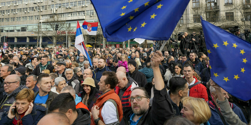 „Ich möchte unsere Freunde in Europa einladen, mehr Augenmerk auf diese Geschehnisse zu legen. Heute weht der europäische Geist durch die Straßen Belgrads“, sagte Politikwissenschaftler Srđan Cvijić bei der Kundgebung. In der Hand hielt er eine zerschlissene EU-Flagge aus den 1990ern, mit der er und seine Familie gegen den damaligen Machthaber Slobodan Milošević demonstriert hätten. Heute müsse die EU stärker gegen Vučić auftreten, der seit Jahren alle Fäden in Serbien zieht.