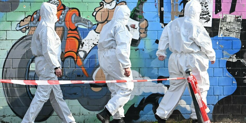 Anders als bei der martialischen Razzia inklusive SEK, Blendgranaten und „sondergeschütztem Offensivfahrzeug“ – besser bekannt als Polizeipanzer Typ „Enok“ – geht es am Montag weitaus ruhiger zu. Auf dem abgeriegelten Gelände verrichten Kriminaltechniker*innen in weißen Schutzanzügen ihr Werk, bewacht von Flatterband und zwei wortkargen Polizisten.