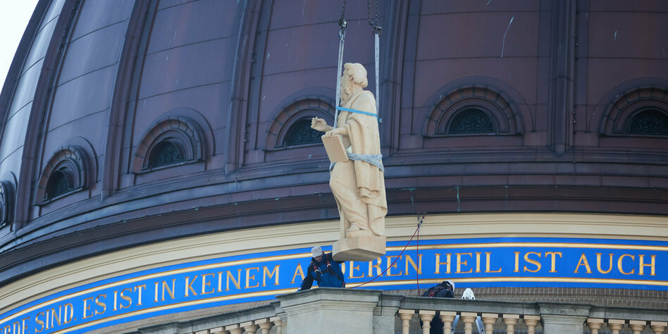 Am Schloss sind die Propheten-Statuen montiert. Wieder mal hat der private Förderverein Berliner Schloss seine ästhetischen Vorstellungen durchgesetzt.