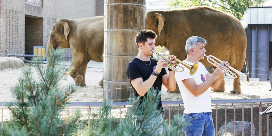 Im Zoo gibt es aber auch hübsche Spazierwege, meist unter prächtigen Bäumen, hier und da findet sich hingesprenkelt der Schatten. Nicht zu vergessen: die Tiere. An diesem Sonntag kommt als weiterer Grund für den Zoo noch die Musik dazu. Das [1][Deutsche Symphonie-Orchester Berlin] (DSO) wirbt an dem Tag mit kurzen auf dem Gelände verteilten Konzerten für die klassische Musik. Kurz nach Mittag ist da etwa bei den Elefanten ein Violinenduo zu hören. Ein Elefant steht im Schatten, ein anderer lässt sich tatsächlich die Sonne auf die Stirn knallen. Näher zur Musik rücken sie nicht.