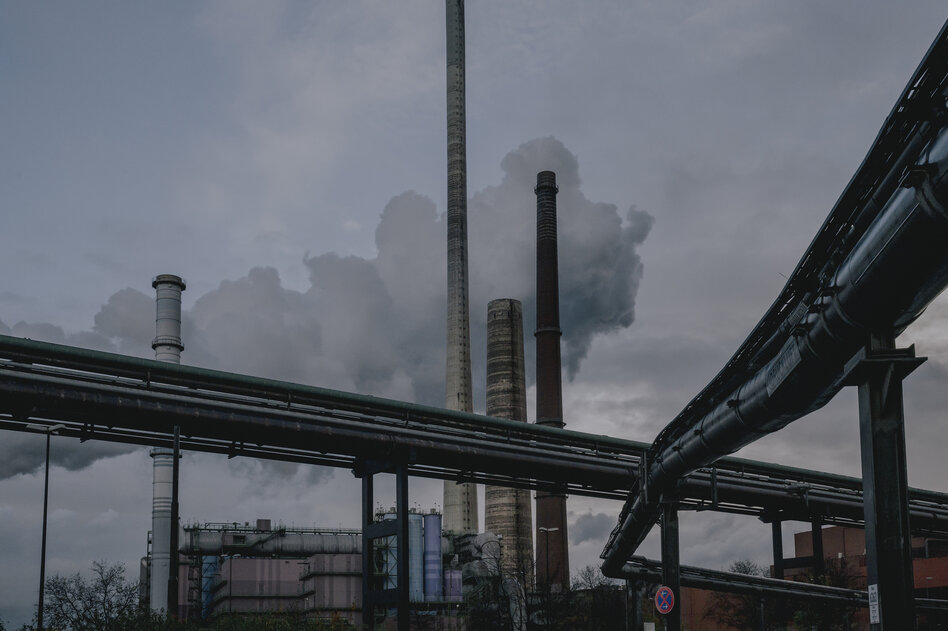 Die gigantische Industrieanlage ist mit den umliegenden Stadtteilen fest verwachsen. Schornsteine, runde und rechteckige Zweckbauten ragen hinter Häusern hervor. Riesige Rohre laufen an Überführungen und Straßen vorbei. „Hochofengas“ oder „Kokereigas“ steht darauf – sehr klimaschädliche Stoffe. Wie die gesamte Branche steht Thyssenkrupp vor einer enormen Herausforderung: Die Produktion des Unternehmens soll klimaneutral werden.