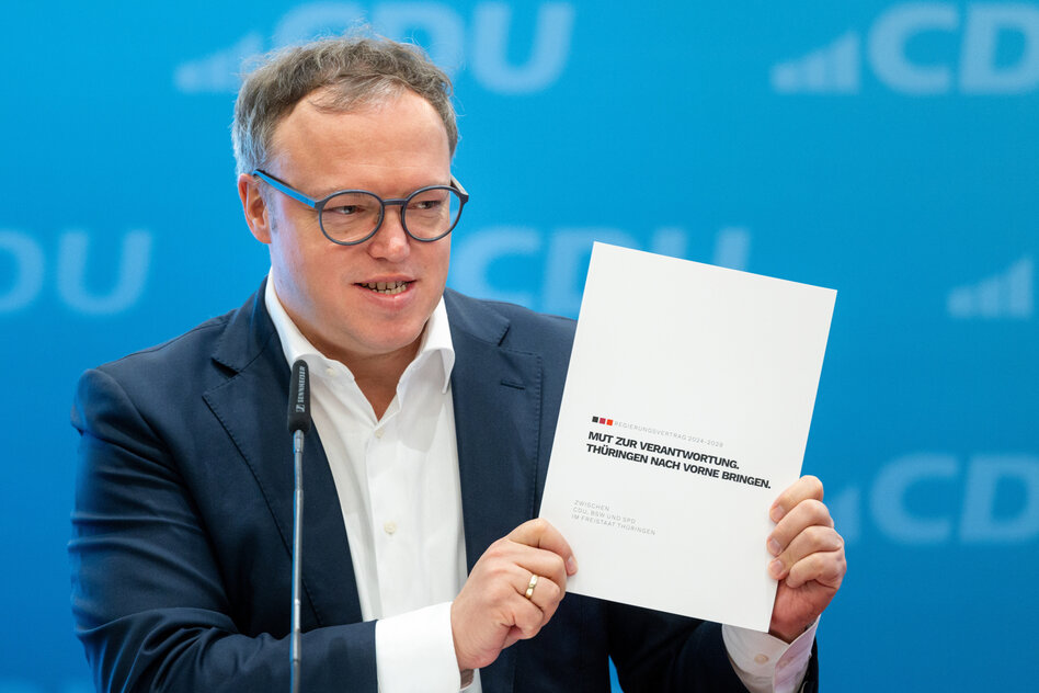 Die AfD war bei der Landtagswahl stärkste Kraft geworden. Ein Bündnis mit der vom Thüringer Verfassungsschutz als gesichert rechtsextremistisch eingestuften AfD schließen alle anderen im neuen Landtag vertretenen Parteien allerdings aus. Weil die CDU auch einen Unvereinbarkeitsbeschluss mit der Linkspartei hat, bleibt den Christdemokraten nur die Option eines Bündnisses mit BSW und SPD.